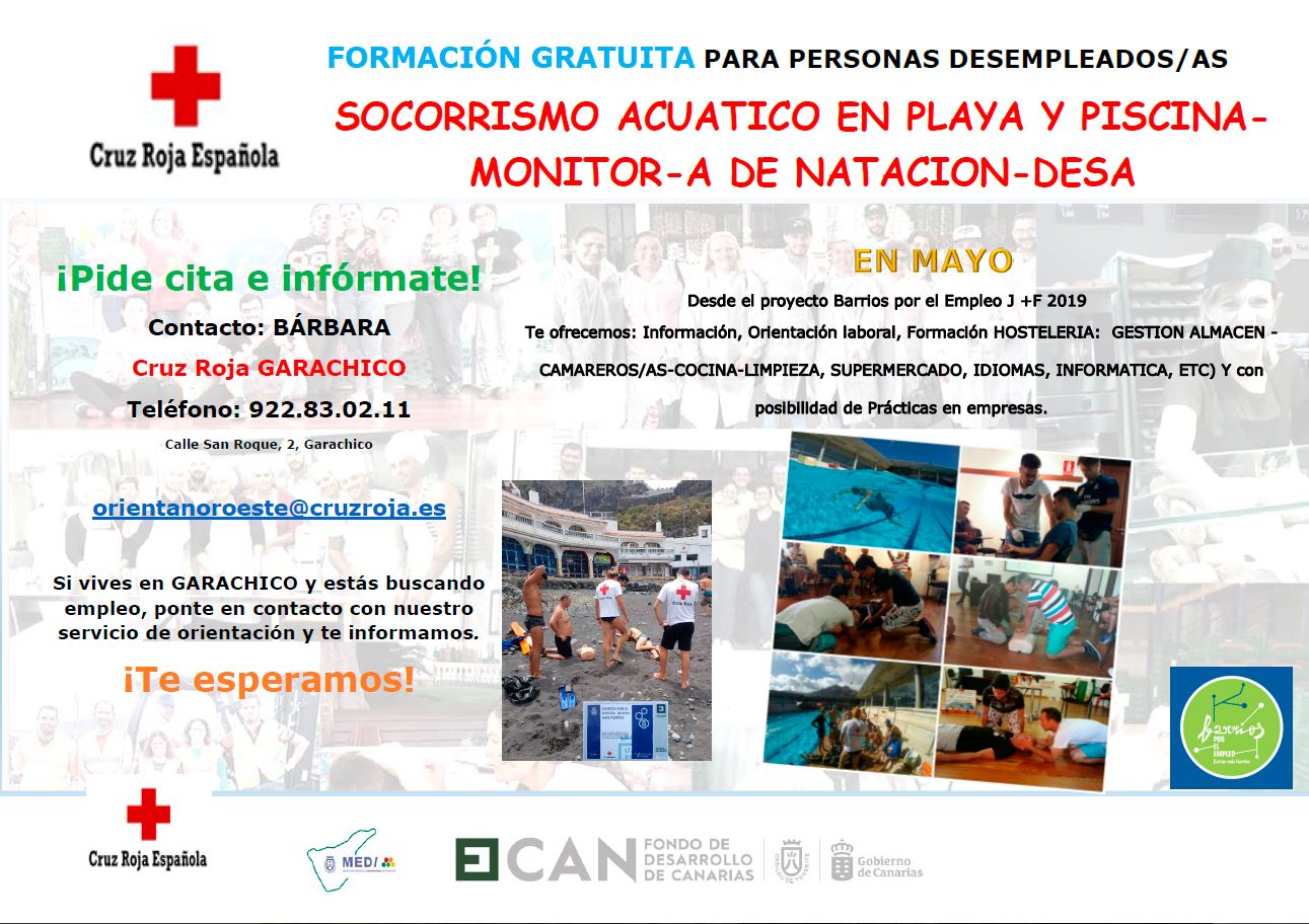 ¿Te gustaría disponer de una titulación oficial que te proporcione acceso al mercado laboral? Desde Cruz Roja en Garachico, a través de su proyecto Barrios por el Empleo, proporcionan a las personas desempleadas del municipio y de manera totalmente gratuita información, orientación laboral y formación homologada para el curso de Socorrista acuático en playa y piscina, además de la titulación como Monitor/a de natación - DESA, con posibilidad de prácticas en empresas.